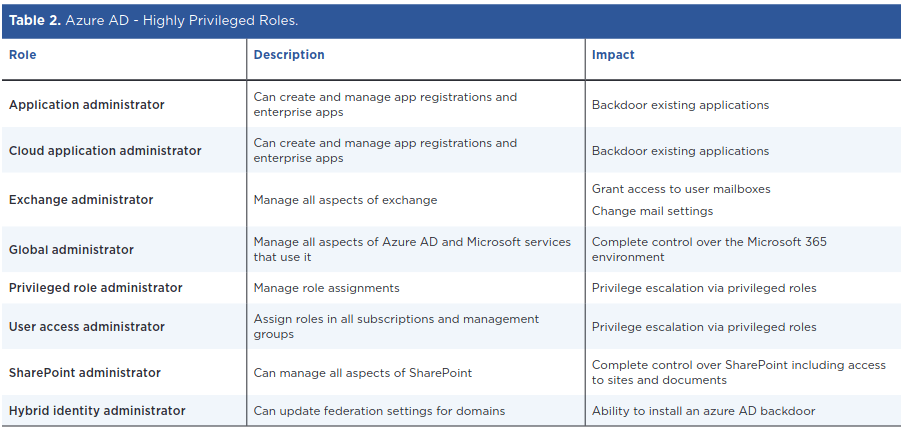 FireEye has published a great hardening remediation plan for Microsoft 365. In their guidance, they shared a table of admin roles that attackers often target.