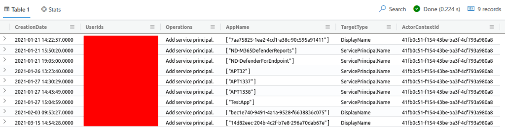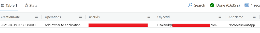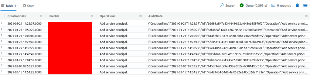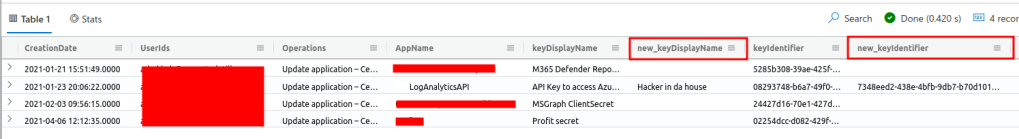 At the sample results, we can see that someone has added a client secret to an existing application. The ‘new_keyIdentifier’ column has a row, where the results is not empty. This means that someone added credentials to an existing application.