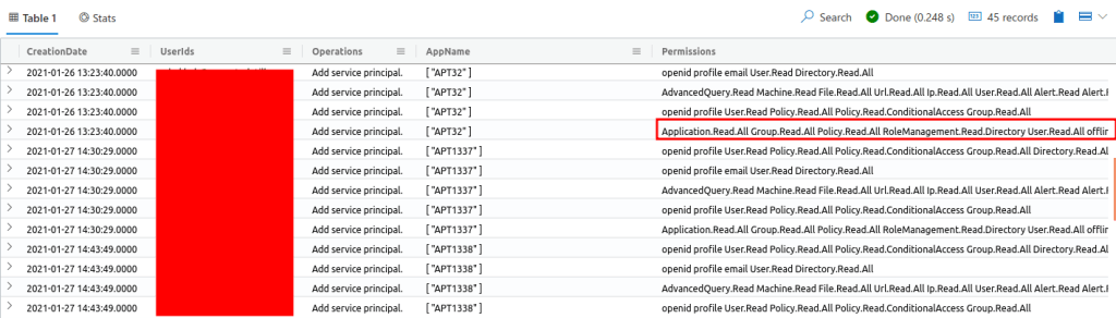 At the sample results, we can see which principal has created an application and consented the mailbox permissions.