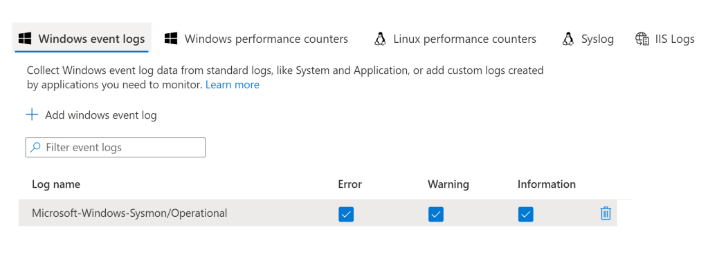 The last part will be configuring the Sysmon events, so we can query it centrally in Azure Sentinel.