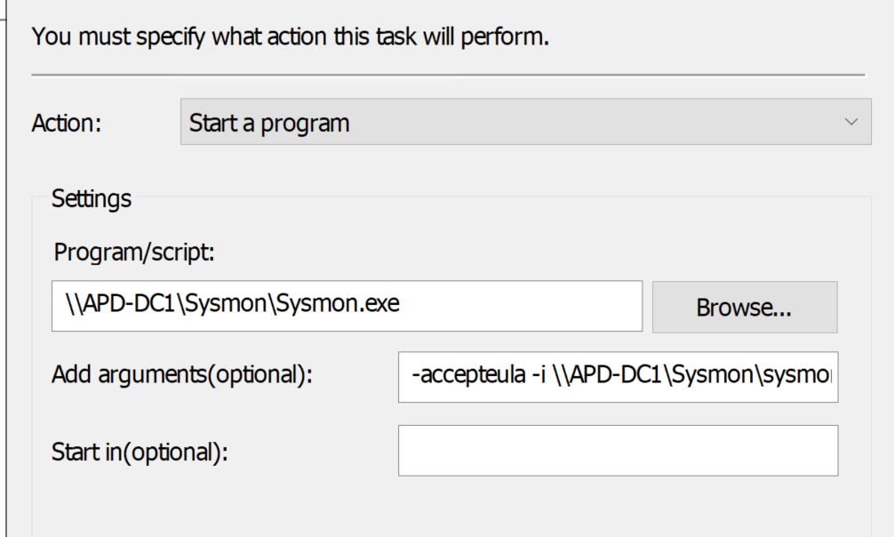 Add arguments(optional): -accepteula -i \APD-DC1\Sysmon\sysmonconfig.xml