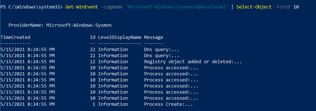 Get-WinEvent -LogName "Microsoft-Windows-Sysmon/Operational" | Select-Object -First 10