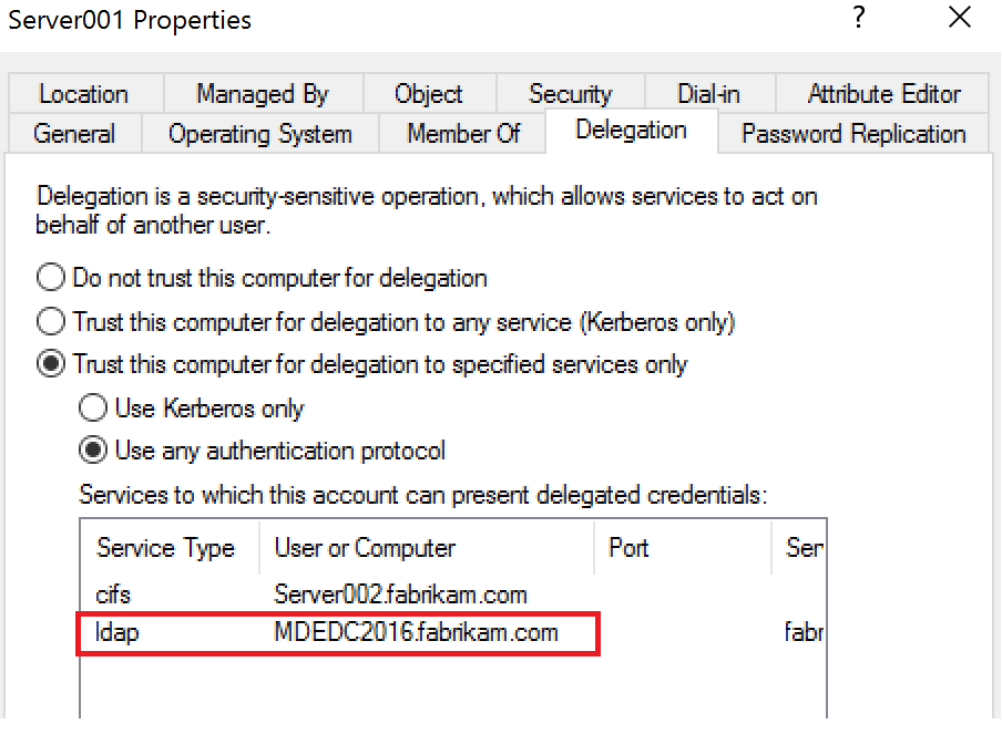 Here we can see that Server001$ is allowed to delegate to the LDAP service on MDEDC2016$, which is in this case. A Domain Controller.