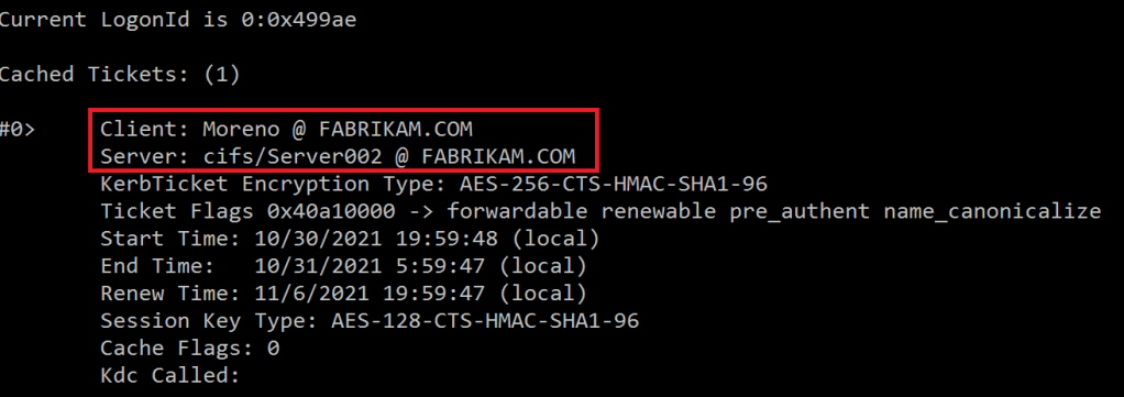At the result, we can see that we have requested a Service Ticket on behalf of Moreno to access the CIFS service on Server002$ host.