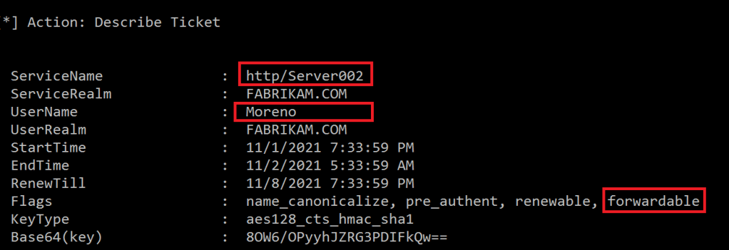 At the result, we can see that we have requested a Service Ticket of Moreno for HTTP service on the Server002$ host. This Kerberos ticket has an forwardable flag. An account can use this special requested ticket to request a service ticket to any service that is specified in the account’s msDS-AllowedToDelegateTo attribute.