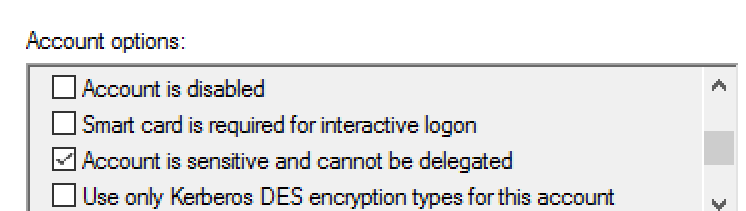 We have mentioned ‘non-protected’ users a couple of times, but when is a user considered to be ‘protected’? Well, there is an checkbox that we can enable. This checkbox will prevent that we can request a Service Ticket on behalf of an protected user to access a service.