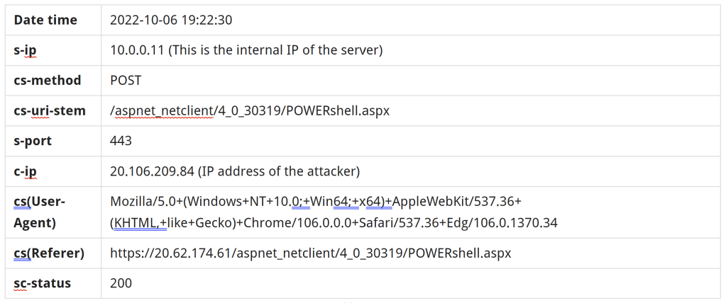 2022-10-06 19:22:30 10.0.0.11 POST /aspnet_netclient/4_0_30319/POWERshell.aspx - 443 - 20.106.209.84 Mozilla/5.0+(Windows+NT+10.0;+Win64;+x64)+AppleWebKit/537.36+(KHTML,+like+Gecko)+Chrome/106.0.0.0+Safari/537.36+Edg/106.0.1370.34 https://20.62.174.61/aspnet_netclient/4_0_30319/POWERshell.aspx 200 0 0 767