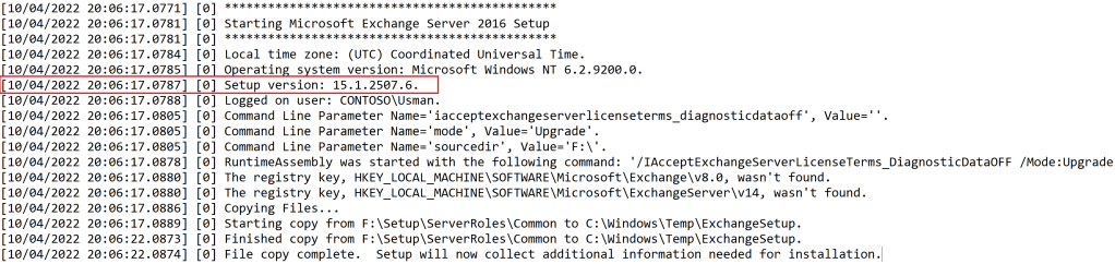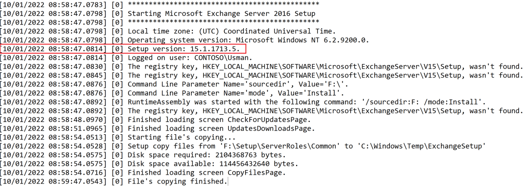 The Setup log tracks the progress of every task during the Exchange installation and configuration. The file contains information about the status of the prerequisite and system readiness checks before installation starts, the application installation progress, and the configuration changes that are made to the system.