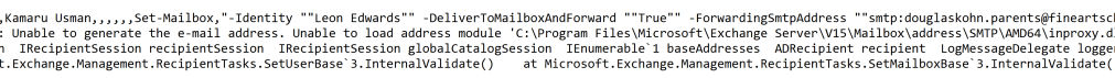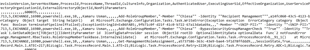 #Fields: DateTime,StartTime,RequestId,ClientRequestId,MajorVersion,MinorVersion,BuildVersion,RevisionVersion,ServerHostName,ProcessId,ProcessName,ThreadId,CultureInfo,Organization,AuthenticatedUser,ExecutingUserSid,EffectiveOrganization,UserServicePlan,IsAdmin,ClientApplication,Cmdlet,Parameters,CmdletUniqueId,UserBudgetOnStart,ContributeToFailFast,RunspaceSettingsCreationHint,ADViewEntireForest,ADRecipientViewRoot,ADConfigurationDomainControllers,ADPreferredGlobalCatalogs,ADPreferredDomainControllers,ADUserConfigurationDomainController,ADUserPreferredGlobalCatalog,ADuserPreferredDomainControllers,ThrottlingInfo,DelayInfo,ThrottlingDelay,IsOutputObjectRedacted,CmdletProxyStage,CmdletProxyRemoteServer,CmdletProxyRemoteServerVersion,CmdletProxyMethod,ProxiedObjectCount,CmdletProxyLatency,OutputObjectCount,ParameterBinding,BeginProcessing,ProcessRecord,EndProcessing,StopProcessing,BizLogic,PowerShellLatency,UserInteractionLatency,ProvisioningLayerLatency,ActivityContextLifeTime,TotalTime,ErrorType,ExecutionResult,CacheHitCount,CacheMissCount,GenericLatency,GenericInfo,GenericErrors,ObjectGuid,ExternalDirectoryOrganizationId,ExternalDirectoryObjectId,NonPiiParameters
