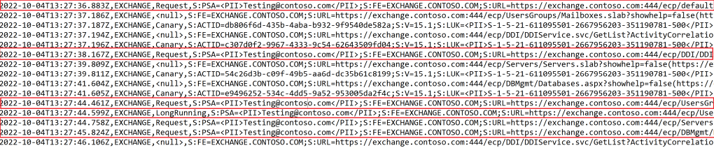2022-10-04T18:11:54.303Z,EXCHANGE,Request,S:PSA=<PII>Testing@contoso.com</PII>;S:FE=EXCHANGE.CONTOSO.COM;S:URL=https://exchange.contoso.com:444/ecp/DBMgmt/NewDAG.aspx?pwmcid=2&ReturnObjectType=1(https://exchange.contoso.com/ecp/DBMgmt/NewDAG.aspx?pwmcid=2&ReturnObjectType=1);S:Bld=15.1.1713.5;S:ActID=7abb1d23-ee8d-44a5-a3ac-536cdbaeffc2;Dbl:WLM.TS=53