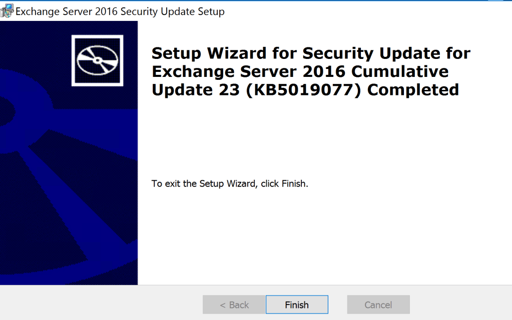 - Security Update For Exchange Server 2016 CU23 (KB5019077): https://www.microsoft.com/en-us/download/details.aspx?id=104671